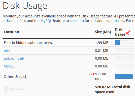 3. From the Disk Space Usage area, you can see which directory is using a lot of space and check the disk usage of MySQL.